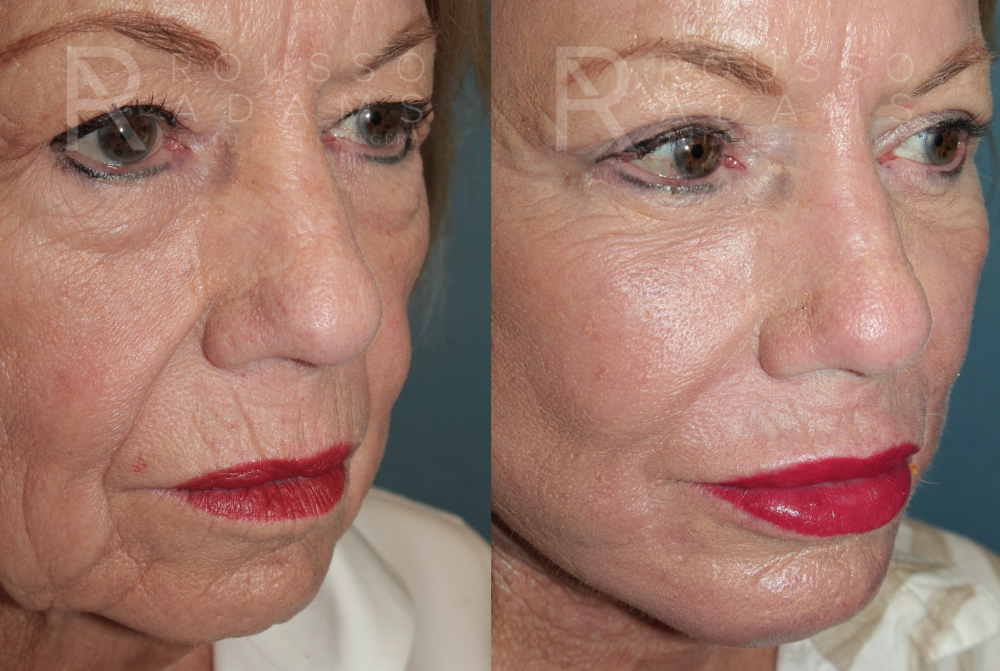 Dr. Rousso performed a SculptLift (facelift and SMAS to naso-labial, melo-labial and lips), YAG laser skin resurfacing to perioral and forehead, plasma skin resurfacing to cheeks, upper and lower blepharoplasty, and a chin implant for this beautiful patient.